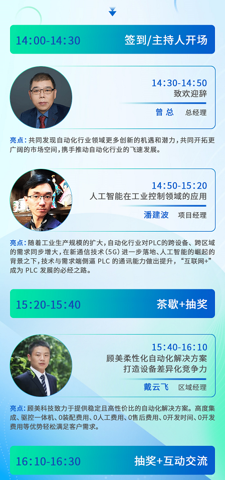 歷經(jīng)20余年培育的 “讓自動(dòng)化控制更簡單” 的品牌號召力和行業(yè)影響力,以及“0裝配費(fèi)用、0人工費(fèi)用、0售后費(fèi)用、0開發(fā)時(shí)間、0開發(fā)費(fèi)用”的優(yōu)勢下,顧美2024·PLC工程師全國巡回研討會(huì)已成為自動(dòng)化行業(yè)領(lǐng)域的首選盛會(huì),我們誠邀您的到來。